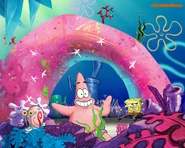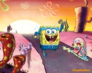 - Bikini Atoll: Die kleine Insel direkt über der Stadt Bikini Bottom, die zum Beispiel beim Wechsel von Tageszeiten gezeigt wird.