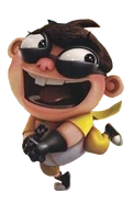 Chum Chum is short and chubby, with peach skin. Like Fanboy, he has a blush on his cheeks, but a little more pale. He has dark brown hair with bangs swoopt to the left. There are two parts at the top, that curl away from each other. His right front tooth in his upper jaw is slightly. He wears an orange and yellow uniform, with white briefs worn outside his costume. In the pilot from Random! Cartoons, Chum Chum wears an orange collared shirt with yellow buttons on the chest instead of his logo.