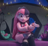 Draculaura is a petite, pear-shaped, light, pink-skinned teenage vampire with pointy ears and sharp fangs inside of her mouth. She sports long straight pink hair with V-shaped bangs - the left side dyed in a shade of purplish black. As per her type of monster, her skin is sensitive to sunlight.