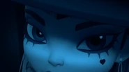 Her eyebrows are fully colored in black, and her pink eyes have noticeable specks of light violet, thick eyelashes protruding from them, and a small heart-shaped beauty mark under the left eye. Her makeup consists of soft-purple eyeshadow, dark pink lip gloss, and black nail polish on her fingernails.