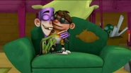 When Fanboy is saving the town or relaxing, he wears his superhero outfit wherever he goes. It consists of a short sleeved, lime green unitard with his emblem on the chest. There are openings in the feet so the toes can poke through. He wears a dark purple hood mask, with matching gloves with two spikes on each and a long, dark purple cape. The mask has slots so his ears can poke through. Fanboy's cape also has three zigzags on the bottom. At the waist on the outside is Fanboy's trademark white underwear with a purple strand. He also has black high-top shoes on his feet.