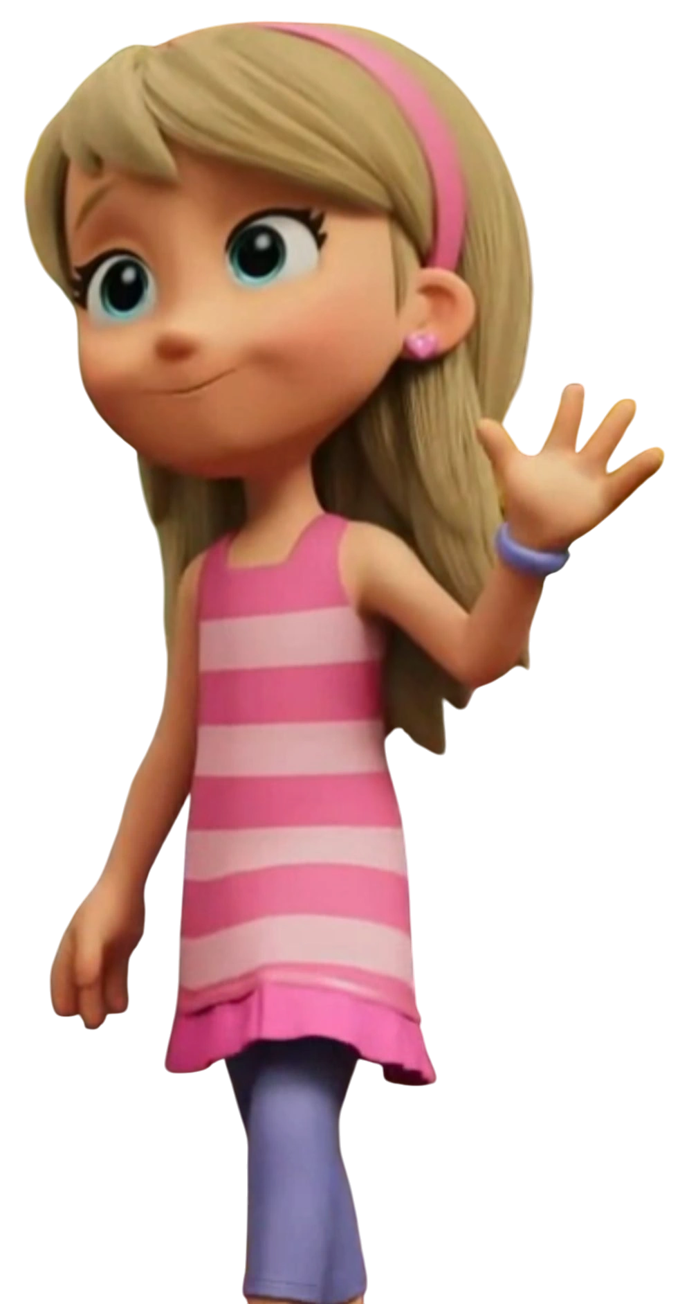 Katie has pale skin, blue eyes and long blonde hair. She wears a red hairband with two pink hearts (depending on the lighting, the red and pink colors of her headband may appear switched). She wears a pink striped dress, blue leggings, and purple slippers (purple flats since Season 8). As of Season 11, she now wears a lavender bracelet on her on her right wrist on her right arm and pink heart shaped earrings.