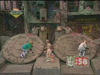 The first round of the show involved a stunt where the six teams had to get across a narrow swimming pool known as the "moat". And during the show's Nick Gas run the logo would be at the bottom right corner. Some of the commonly used methods included rafts, ropes, and bridges. All six teams attempted to get both members across according to the rules and punch a button, thus setting off the team's "gong". Typically, if a team member fell in the water, that partner (or occasionally both teammates) would have to go back and try again until they could get across. The first four teams to hit their gongs advanced to the second round.