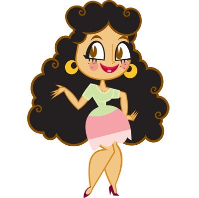 Maria is a natural brunette who has long curly hair. She also has brown skin and freckles. She is adult years old. Her usual outfit is consisted of two golden earrings, red lipstick, lime green top, pink skirt and red heels.