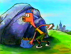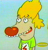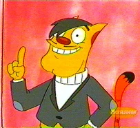 update: There's been some debate on just what kind of creature he is, my first thought some type of monkey species. Then someone brought up the idea of a tree sloth. It finally came to me with his slow talking, and slow walking why not a turtle but one that's out of his shell? His face is sort of turtle shaped too. What do you think? This and many other CatDog topics are being brought up in my mailing list.