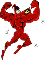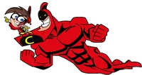 The Crimson Chin wears typical uni-colored (in this case, crimson red) spandex outfit, is extremely muscular and was turned into a comic world, and ended up running out of metaphors by the end of the episode. His body is very powerful, and his pecs are also big. He also has an 8-pack abs, powerful legs, and a bubble butt. He also seems to be supremely intelligent, taunting Short-Fuse to spill out the cage's weakness and break out of it from the outside by provoking Short-Fuse and causing the latter to explode in anger. He also doesn't mind if his powers get taken away, as he is positive about normal people and defeated the Nega Chin without it, with the help of other normal 'heroes'; Timmy and his friends.