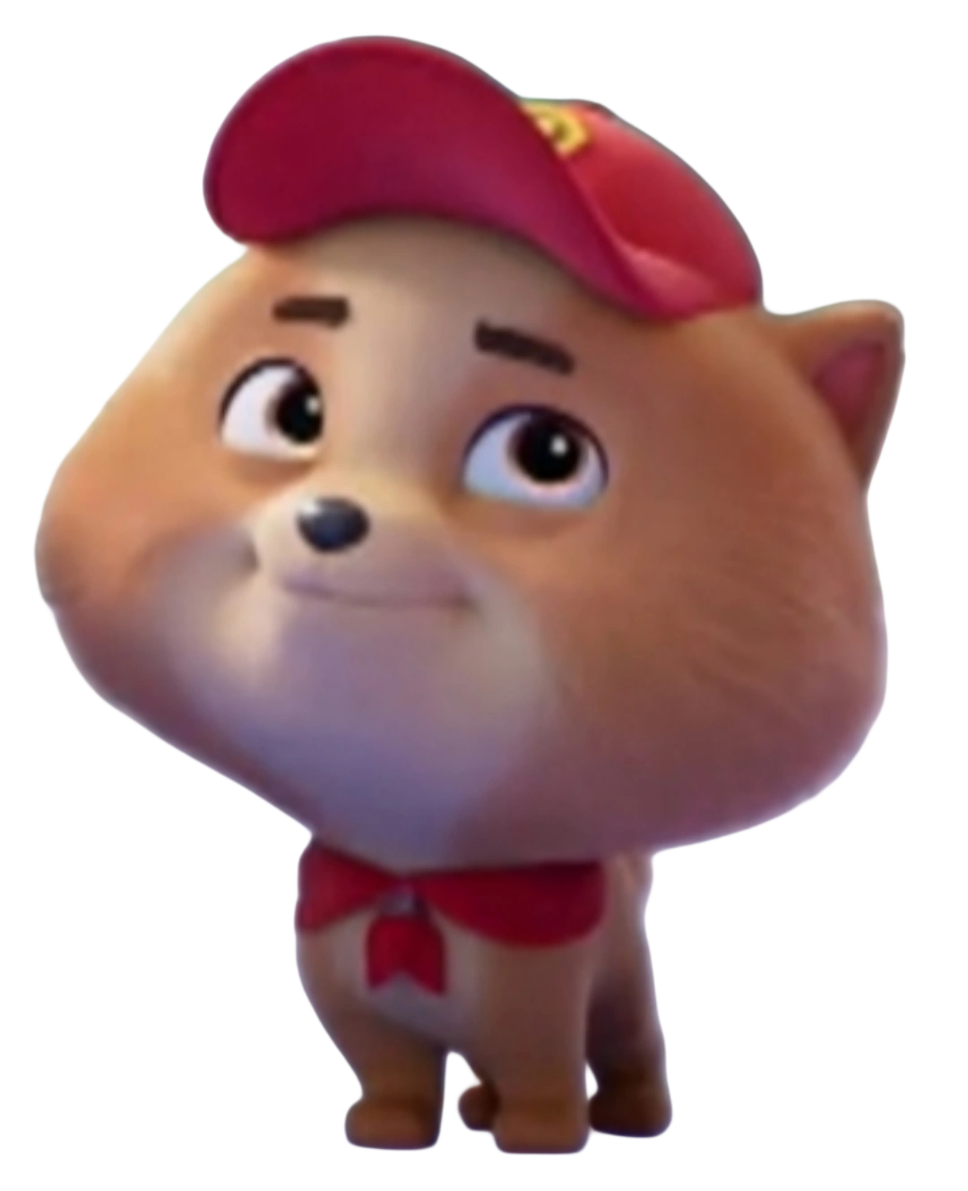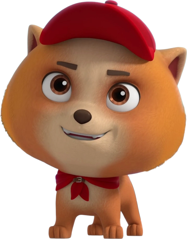 Tot has a double coat of light orange fur, a cream muzzle with a stripe between his eyes, a cream chest, small triangle ears, and a fluffy tail. He has brown eyes, small brown eyebrows, and a brown nose. He wears a red cap with his pup tag in the center and a red neckerchief with a small brown belt buckled around the ends in the center.