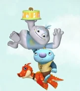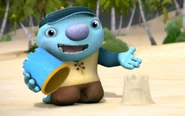 Wally is a blue troll with a purple nose, his hair and eyebrows is yellow. He also had one big tooth in the bottom from his mouth. He has blue sleeves and wears a tan vest with four brown buttons. He wears his brown pants. He has a three toed foot each. He's got two small ears. He has four fingers on each hand. Wally can also be seen holding his magic stick.