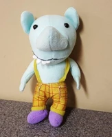 Winslow is turquoise with black beady eyes. He has green plaid overalls. Winslow's shoes are brown. His tongue is pink and his teeth are white.